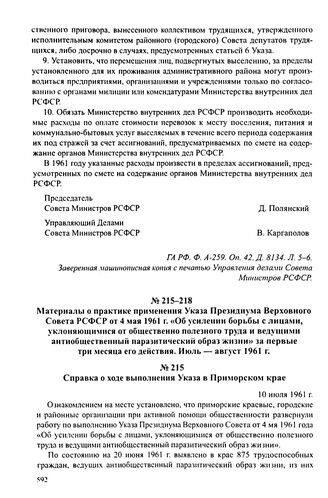Материалы о практике применения Указа Президиума Верховного Совета РСФСР от 4 мая 1961 г. «Об усилении борьбы с лицами, уклоняющимися от общественно полезного труда и ведущими антиобщественный паразитический образ жизни» за первые три месяца его действия. Июль — август 1961 г. Справка о ходе выполнения Указа в Приморском крае. 10 июля 1961 г. // ГА РФ. Ф. А-259. Оп. 42. Д. 6545. Л. 60-71. Подлинник. Машинопись. Подпись — автографы.