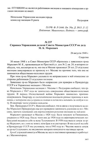 Дело о прописке М. К. Маркевич. Ноябрь 1947 — август 1948 г. Справка Управления делами Совета Министров СССР по делу М. К. Маркевич. 26 августа 1948 г. // ГА РФ. Ф. Р-5446. Оп. 50а. Д. 3913. Л. 21. Подлинник. Машинопись. Подпись — автограф.