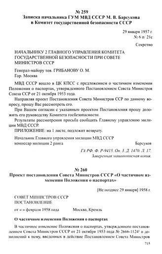 Предложения МВД СССР об отмене паспортных ограничений для отдельных категорий граждан. 1957-1959 гг. Проект постановления Совета Министров СССР «О частичном изменении Положения о паспортах». [Не позднее 29 января] 1958 г.