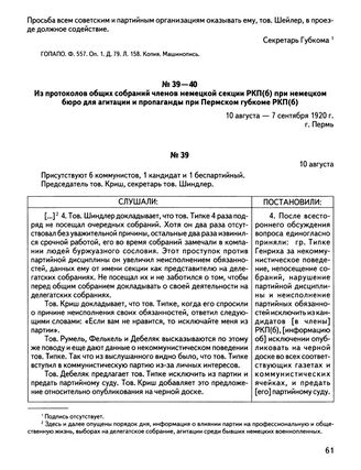 Главная Немцы в Прикамье. XX век Немцы в Прикамье. XX век. Т. I. Кн. 1 Документы Из протокола общего собрания членов немецкой секции РКП(б) при неме...