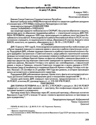 Приговор Военного трибунала войск НКВД Молотовской области по делу Г.П. Дика. 8 апреля 1942 г., г. Соликамск Молотовской области // ГОПАПО. Ф. 643/2. Оп. 1. Д. 86170. Л. 61—62. Подлинник. Рукопись.