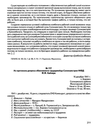 Из протокола допроса обвиняемого трудармейца Соликамстроя НКВД Ф.Ф. Кайзера. 16 декабря 1941 г., п. Боровск Соликамского района Молотовской области // ГОПАПО. Ф. 643/2. Оп. 1. Д. 84031. Л. 7-8 об. Подлинник.