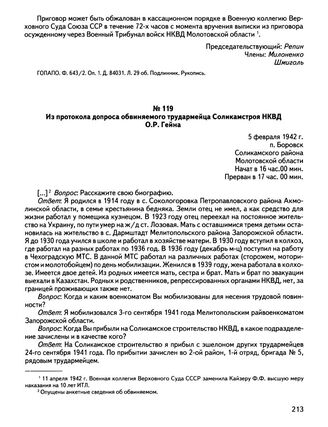 Из протокола допроса обвиняемого трудармейца Соликамстроя НКВД О.Р. Гейна. 5 февраля 1942 г., п. Боровск Соликамского района Молотовской области // ГОПАЛО. Ф. 643/2. Оп. 1. Д. 84200. Л. 10—11 об. Подлинник. Рукопись.