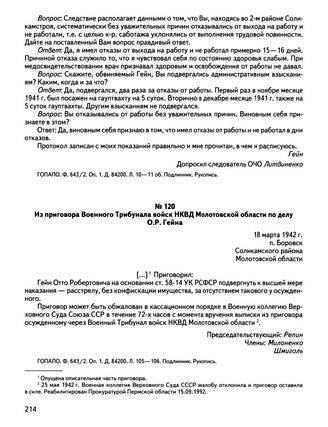 Из приговора Военного Трибунала войск НКВД Молотовской области по делу О.Р. Гейна. 18 марта 1942 г., п. Боровск Соликамского района Молотовской области