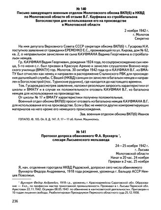 Протокол допроса обвиняемого Ф.А. Вуккерта, слесаря Лысьвенского мельзавода. 24—25 ноября 1942 г., г. Лысьва Молотовской области