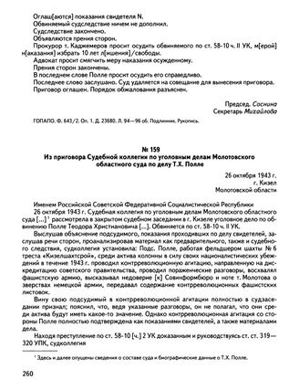 Из приговора Судебной коллегии по уголовным делам Молотовского областного суда по делу Т.Х. Полле. 26 октября 1943 г., г. Кизел Молотовской области // ГОПАПО. Ф. 643/2. Оп. 1. Д. 23680. Л. 97—97 об. Подлинник. Рукопись.