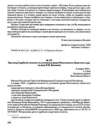 Приговор Судебной коллегии по уголовным делам Молотовского областного суда по делу Я.Ф. Вильмана. 6 января 1944 г., п. Створ Чусовского района Молотовской области // ГОПАПО. Ф. 643/2. Оп. 1. Д. 86362. Л. 51—51 об. Подлинник. Рукопись.