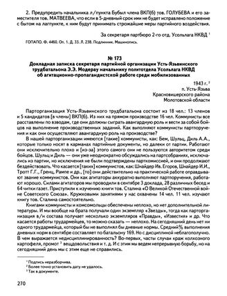 Докладная записка секретаря партийной организации Усть-Язьвинского трудбатальона Э.Э. Модерау начальнику политотдела Усольлага НКВД об агитационно-пропагандистской работе среди мобилизованных. 1943 г., п. Усть-Язьва Красновишерского района Молотовской области // ГОПАПО. Ф. 4460. Оп. 1. Д. 39. Л. 42—42 об. Подлинник. Рукопись.
