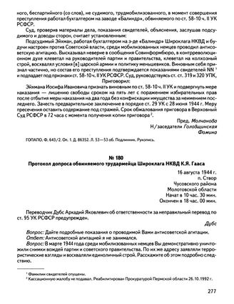 Протокол допроса обвиняемого трудармейца Широклага НКВД К.Я. Гааса. 16 августа 1944 г., п. Створ Чусовского района Молотовской области // ГОПАПО. Ф. 643/2. Оп. 1. Д. 86357. Л. 12—12 об. Подлинник. Рукопись.