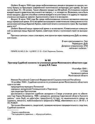 Приговор Судебной коллегии по уголовным делам Молотовского областного суда по делу К.Я. Гааса. 14 октября 1944 г., п. Створ Чусовского района Молотовской области // ГОПАПО. Ф. 643/2. Оп. 1. Д. 86357. Л. 48—48 об. Подлинник. Рукопись.