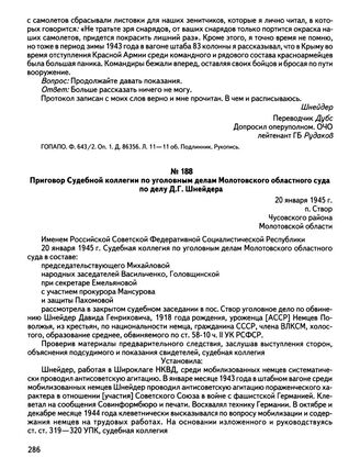 Приговор Судебной коллегии по уголовным делам Молотовского областного суда по делу Д.Г. Шнейдера. 20 января 1945 г., п. Створ Чусовского района Молотовской области