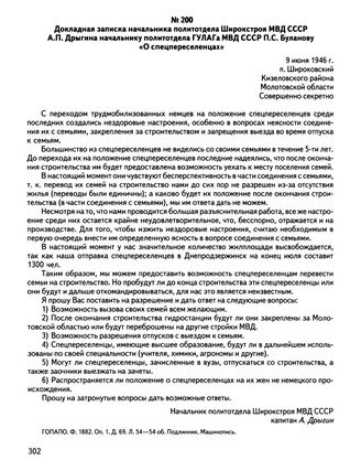 Докладная записка начальника политотдела Широкстроя МВД СССР А.П. Дрыгина начальнику политотдела ГУЛАГа МВД СССР П.С. Буланову «О спецпереселенцах». 9 июня 1946 г., п. Широковский Кизеловского района Молотовской области // ГОПАПО. Ф. 1882. Оп. 1. Д. 69. Л. 54—54 об. Подлинник. Машинопись.