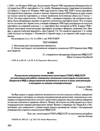 Разъяснение помощника начальника политотдела ГУЛАГа МВД СССР по комсомольской работе помощнику начальника политотдела по комсомолу Широклага МВД о предоставлении возможности учиться в вузах комсомольцам и молодежи из немцев-спецпереселенцев. 31 августа 1946 г., г. Москва