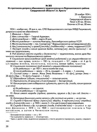 Из протокола допроса обвиняемого трудпоселенца из Ворошиловского района Свердловской области Г.А. Криста. 29 ноября 1934 г., г. Березники Свердловской области