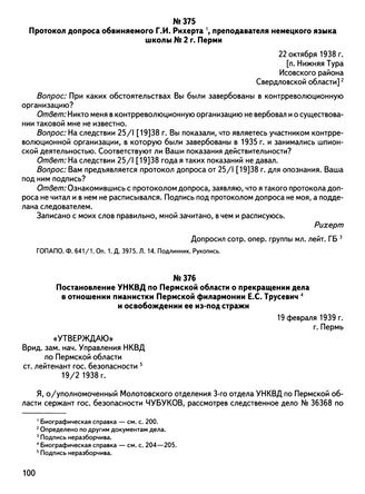 Постановление УНКВД по Пермской области о прекращении дела в отношении пианистки Пермской филармонии Е.С. Трусевич и освобождении ее из-под стражи. 19 февраля 1939 г., г. Пермь // ГОПАПО. Ф. 641/1. Оп. 1. Д. 5016. Л. 33—34. Подлинник. Машинопись.