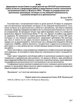 Циркулярное письмо Совета по делам религий при СМ СССР уполномоченным Совета на местах о продолжении работы и представлении отчетов о выполнении постановления Совета от 28 августа 1974 г. «О мерах по упорядочению сети религиозных организаций, состоящих из лиц немецкой национальности, и усилению контроля за их деятельностью». 28 июня 1978 г. // ГАПО. Ф. р-1204. Оп. 2. Д. 31. Л. 123—124. Подлинник. Машинопись.
