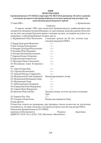 Информация Кривошеинского РО НКВД секретарю РК ВКП(б) Каштанову об учете в районе ссыльных кулаков и интернированных польских граждан как резерве для пополнения рядов Красной Армии. 17 мая 1943 г.