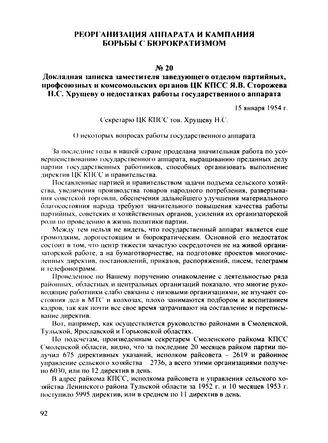 Докладная записка заместителя заведующего отделом партийных, профсоюзных и комсомольских органов ЦК КПСС Я.В. Сторожева Н.С. Хрущеву о недостатках работы государственного аппарата. 15 января 1954 г. // РГАНИ. Ф. 3. Оп. 8. Д. 81. Л. 29-40. Копия.