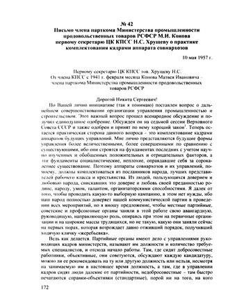 Письмо члена парткома Министерства промышленности продовольственных товаров РСФСР М.И. Конова первому секретарю ЦК КПСС Н.С. Хрущеву о практике комплектования кадрами аппарата совнархозов. 10 мая 1957 г.