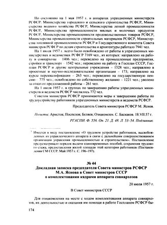 Докладная записка председателя Совета министров РСФСР М.А. Яснова в Совет министров СССР о комплектовании кадрами аппарата совнархозов. 20 июля 1957 г. // РГАСПИ. Ф. 556. Оп. 21. Д. 48. Л. 66-69. Копия.