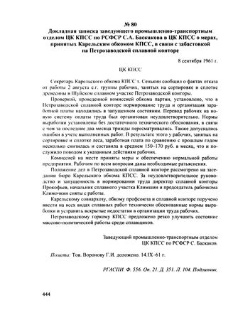 Докладная записка заведующего промышленно-транспортным отделом ЦК КПСС по РСФСР С.А. Баскакова в ЦК КПСС о мерах, принятых Карельским обкомом КПСС, в связи с забастовкой на Петрозаводской сплавной конторе. 8 сентября 1961 г. // РГАСПИ. Ф. 556. Оп. 21. Д. 351. Л. 104. Подлинник.