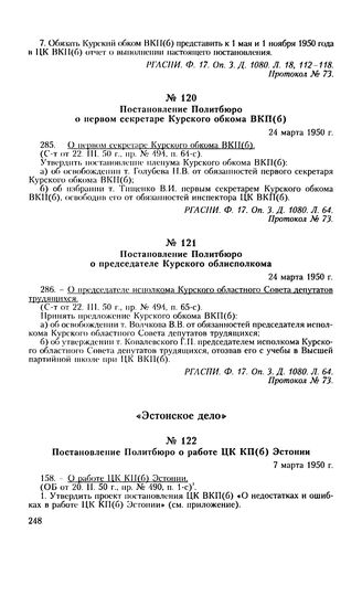 Постановление Политбюро о председателе Курского облисполкома. 24 марта 1950 г. Протокол № 73 // РГАСПИ. Ф. 17. Оп. 3. Д. 1080. Л. 64.