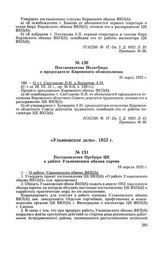 Постановление Политбюро о председателе Кировского облисполкома. 31 марта 1952 г. Протокол № 86 // РГАСПИ. Ф. 17. Оп. 3. Д. 1093. Л. 42.