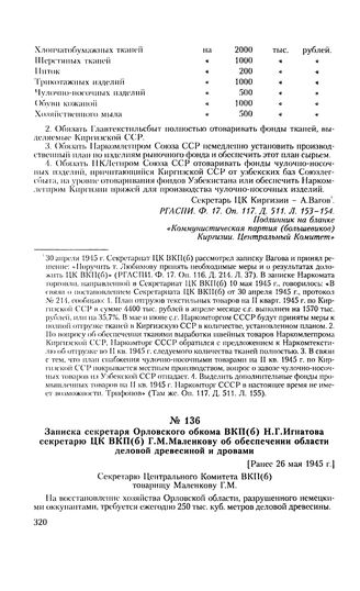 Записка секретаря Орловского обкома ВКП(б) Н. Г. Игнатова секретарю ЦК ВКП(б) Г. М. Маленкову об обеспечении области деловой древесиной и дровами. [Ранее 26 мая 1945 г.] // РГАСПИ. Ф. 17. Оп. 117. Д. 514. Л. 170-171. Заверенная машинописная копия.