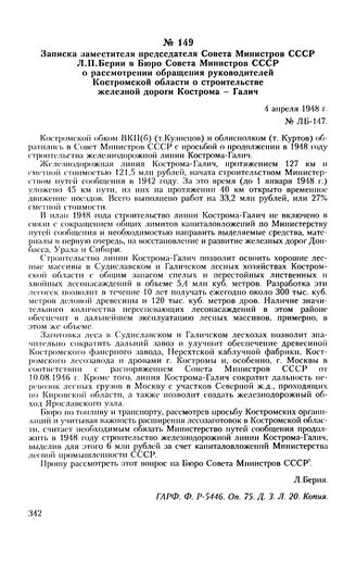 Записка заместителя председателя Совета Министров СССР Л. П. Берии в Бюро Совета Министров СССР о рассмотрении обращения руководителей Костромской области о строительстве железной дороги Кострома - Галич. 4 апреля 1948 г. // ГАРФ. Ф. Р-5446. Оп. 75. Д. 3. Л. 20. Копия.