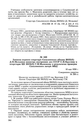Записка первого секретаря Сахалинского обкома ВКП(б) Д. Н. Мельника министру внутренних дел СССР С. Н. Круглову и секретарю ЦК ВКП(б) Г. М. Маленкову о результатах проверки Сахалинского лагеря МВД. 10 мая 1950 г. // ГАРФ. Ф. Р-5446. Оп. 80а. Д. 7743. Л. 4-7. Заверенная машинописная копия.