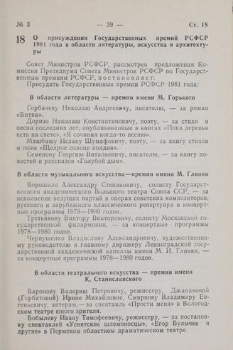 Постановление Совета Министров РСФСР. О присуждении Государственных премий РСФСР 1981 года в области литературы, искусства и архитектуры. 24 декабря 1981 г. № 686