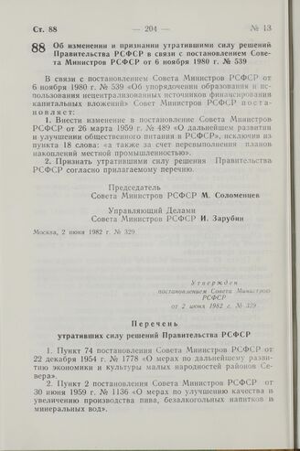 Постановление Совета Министров РСФСР. Об изменении и признании утратившими силу решений Правительства РСФСР в связи с постановлением Совета Министров РСФСР от 6 ноября 1980 г. № 539. 2 июня 1982 г. № 329