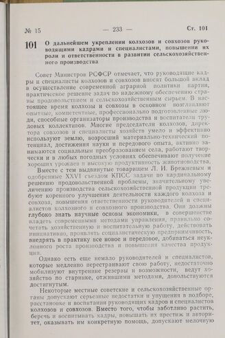 Постановление Совета Министров РСФСР. О дальнейшем укреплении колхозов и совхозов руководящими кадрами и специалистами, повышении их роли и ответственности в развитии сельскохозяйственного производства. 24 июня 1982 г. № 372