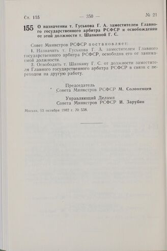 Постановление Совета Министров РСФСР. О назначении т. Гуськова Г.А. заместителем Главного государственного арбитра РСФСР и освобождении от этой должности т. Шапкиной Г.С. 13 октября 1982 г. № 538