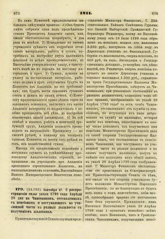 1811. Сентября 27. О распространении силы указа 1798 года Апреля 28 дня на Чиновников, отставленных с пенсионом и поступающих по училищной части в разные должности с получением жалованья