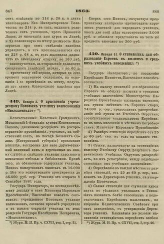 1863. Января 11. О стипендиях для образования Евреев в низших и средних учебных заведениях // Журн. М. Н. Пр. ч. СХVІІ, отд. I, стр. 26.