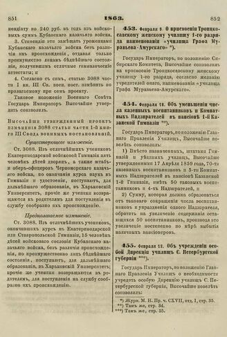 1863. Февраля 18. Об уменьшении числа казенных воспитанников и Комнатных Надзирателей в пансионе 1-й Казанской Гимназии // Журн. М. Н. Пр. ч. СХVІІ, отд. I, стр. 34.