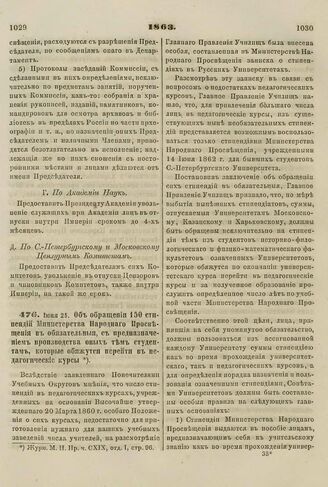 1863. Июня 25. Об обращении 150 стипендий Министерства Народного Просвещения в обязательные, с предназначением производства оных тем студентам, которые обяжутся перейти в педагогические курсы // Журн. М. Н. Пр. ч. СХІХ, отд. I, стр. 96.