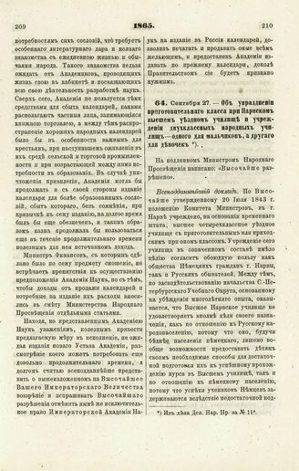 1865. Сентября 27. — Об упразднении приготовительного класса при Нарвском высшем уездном училище и учреждении двухклассных народных училищ — одного для мальчиков, а другого для девочек. Всеподданнейший доклад