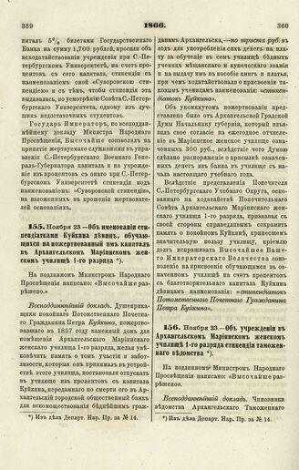 1866. Ноября 23. — Об именовании стипендиатками Куйкина девиц, обучающихся на пожертвованный им капитал в Архангельском Мариинском женском училище 1-го разряда. Всеподданнейший доклад // Из дела Департ. Нар. Пр. за № 14.