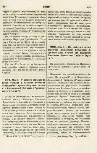1867. Мая 8. — О порядке передачи на время ученым и высшим учебным учреждениям рукописей и редких книг из Московского Публичного и Румянцевского Музеев // Журн. М. Н. Пр. Ч. СХХХІV, отд. I, стр. 29.