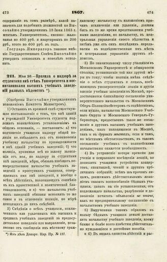 1867. Мая 26. — Правила о надзоре за студентами вне стен Университета и воспитанниками высших учебных заведений разных ведомств