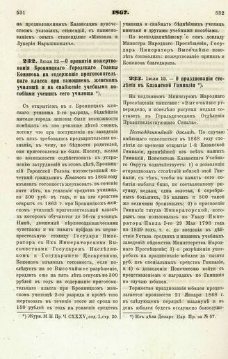 1867. Июля 12. — О принятии пожертвования Бронницкого Городского Головы Кононова на содержание приготовительного класса при тамошнем женском училище и на снабжение учебными пособиями учениц сего училища // Журн. М. Н. Пр. Ч. СХХХV, отд. I, стр. 20.