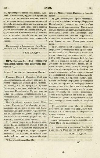 1869. Февраля 14. — Об устройстве управления делами Греко-Униатского исповедания. Указ Правительствующему Сенату. Выписка из журнала Комитета по делам Царства Польского // Из дела Департ. Нар. Пр.