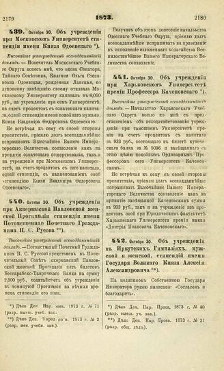 1873. Октября 30. Об учреждении при Московском Университете стипендии имени Князя Одоевского. Высочайше утвержденный всеподданнейший доклад