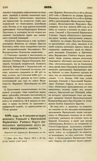1873. Ноября 25. О введении в курс женских Гимназий и Прогимназий Варшавского Учебного Округа обязательного преподавания двух новых иностранных языков // Дело Деп. Нар. Просв. 1872 г. № 21а (разр. женск. учеб. зав.).