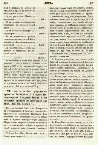 1874. Июля 3. — Об увеличении средств библиотеки и музеев Императорской Академии Наук и об открытии кредита на постройку для сих музеев мебели // Дело Деп. Нар. Просв. 1873 г. № 17 (разр. учен. учрежд.).