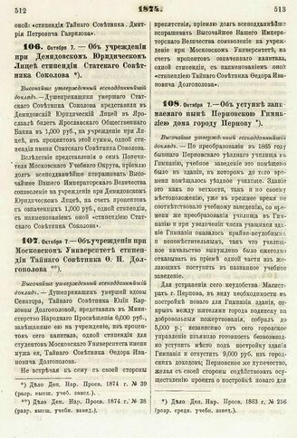 1874. Октября 7. — Об учреждении при Демидовском Юридическом Лицее стипендии Статского Советника Соколова. Высочайше утвержденный всеподданнейший доклад // Дело Деп. Нар. Просв. 1874 г. № 39 (разр. высш. учеб. завед.).