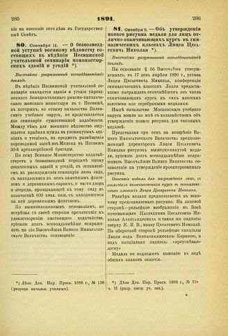 1891. Октября 5. — Об утверждении нового рисунка медали для лиц отлично оканчивающих курс в гимназических классах Лицея Цесаревича Николая. Высочайше разрешенный всеподданнейший доклад // Дело Деп. Нар. Просв. 1888 г., № 71а, ч. II (разр. высш. уч. зав.).