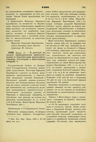 1892. Марта 17. — О расходе на выдачу вознаграждения законоучителям и блюстителям начальных училищ Седлецкой и Люблинской губерний // Дело Деп. Нар. Просв. 1889 г., № 160 (разр. нач. уч.).